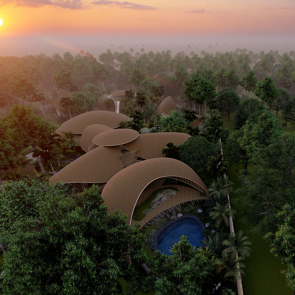 A bespoke arrangement of bamboo buildings which provide accomodation, restaurant, and yoga hall within landscaped permaculture garden.